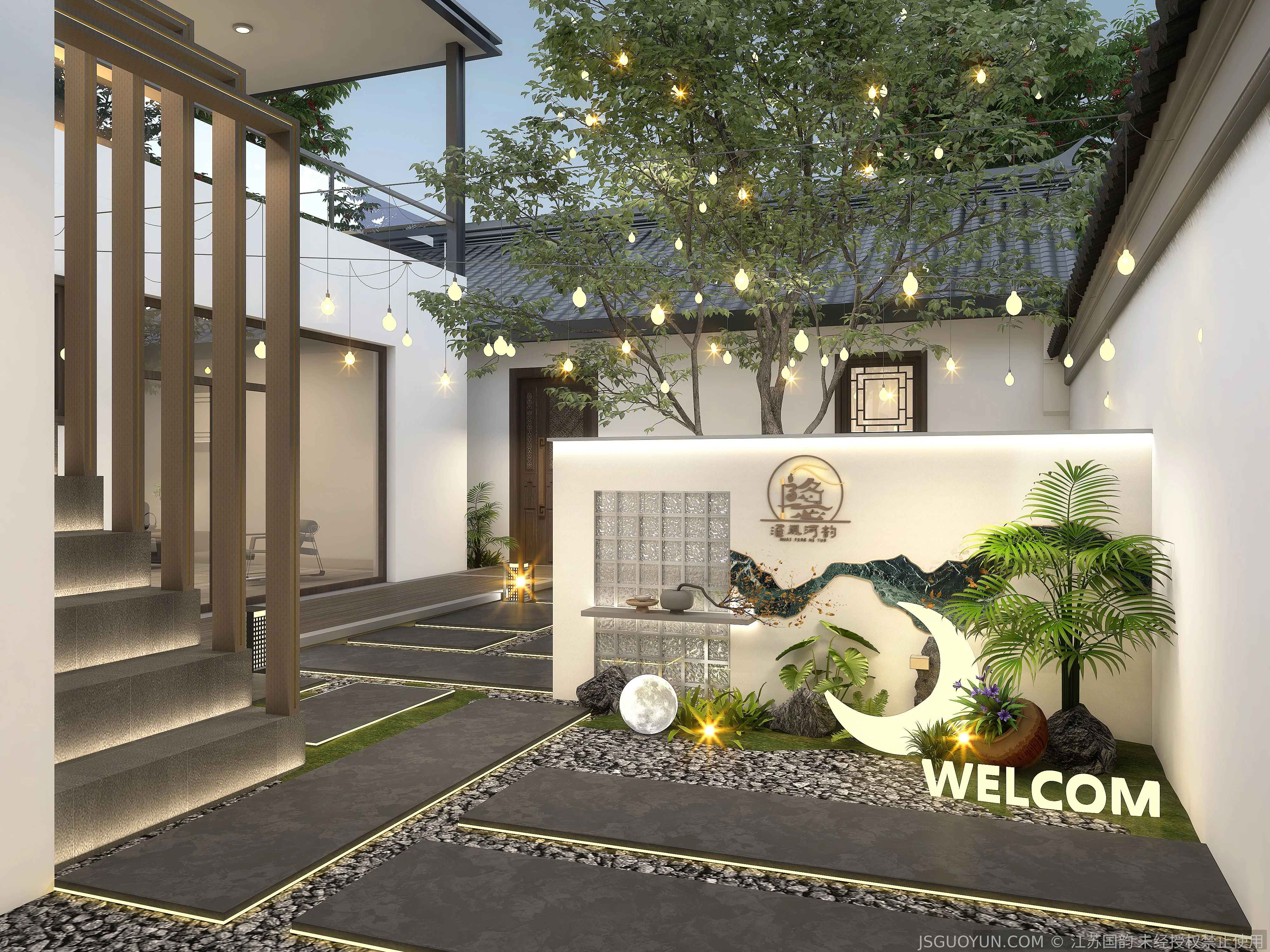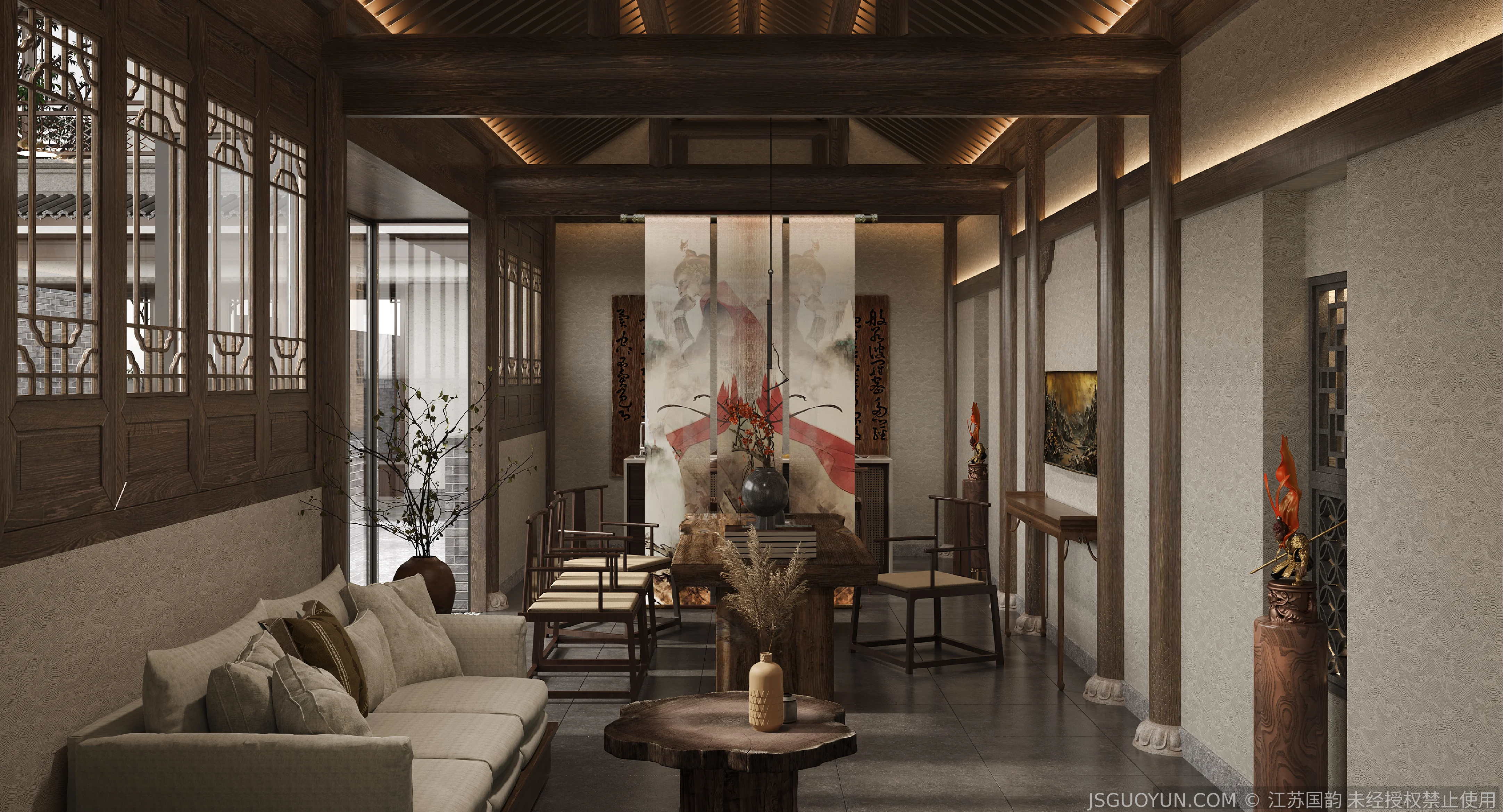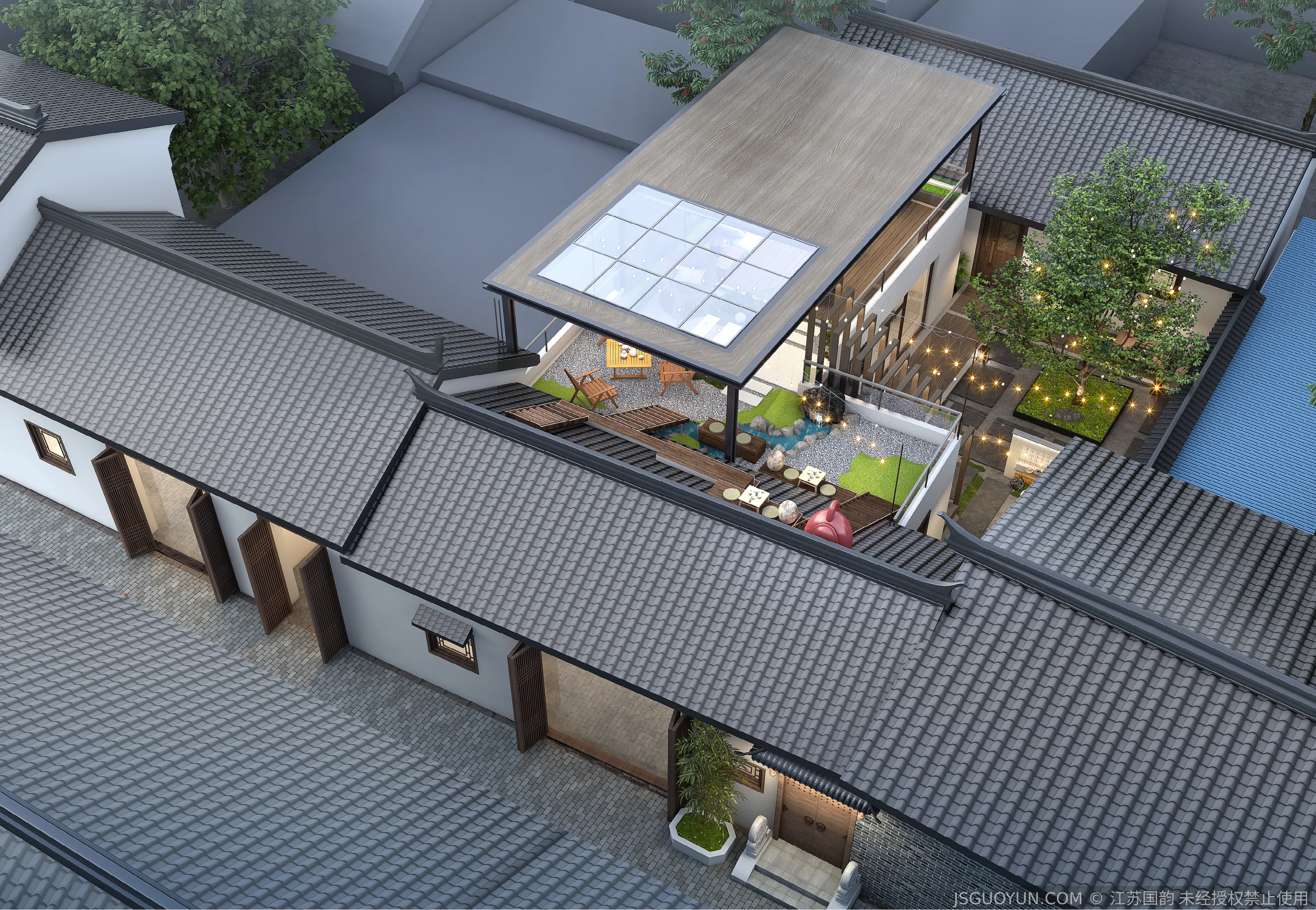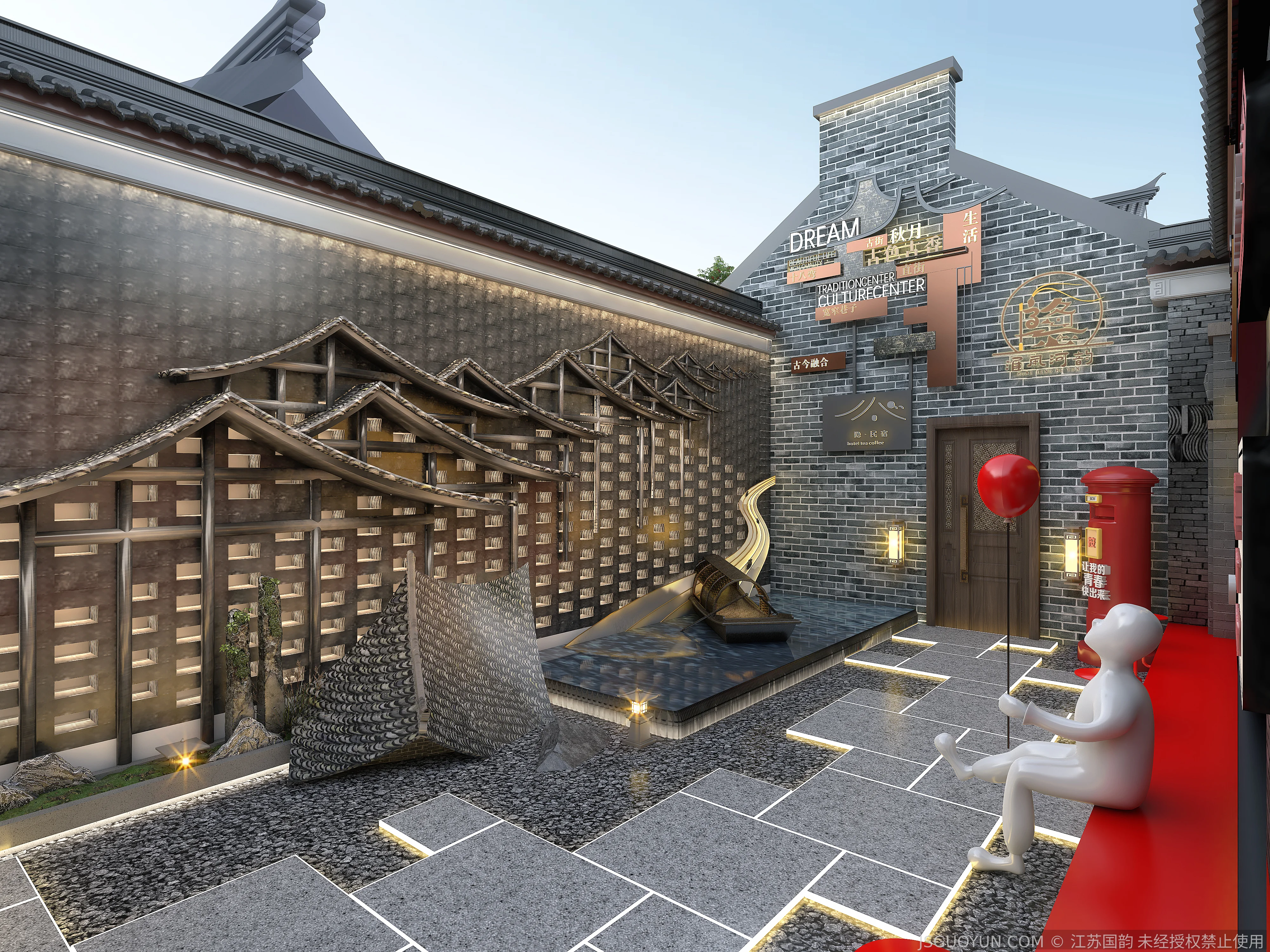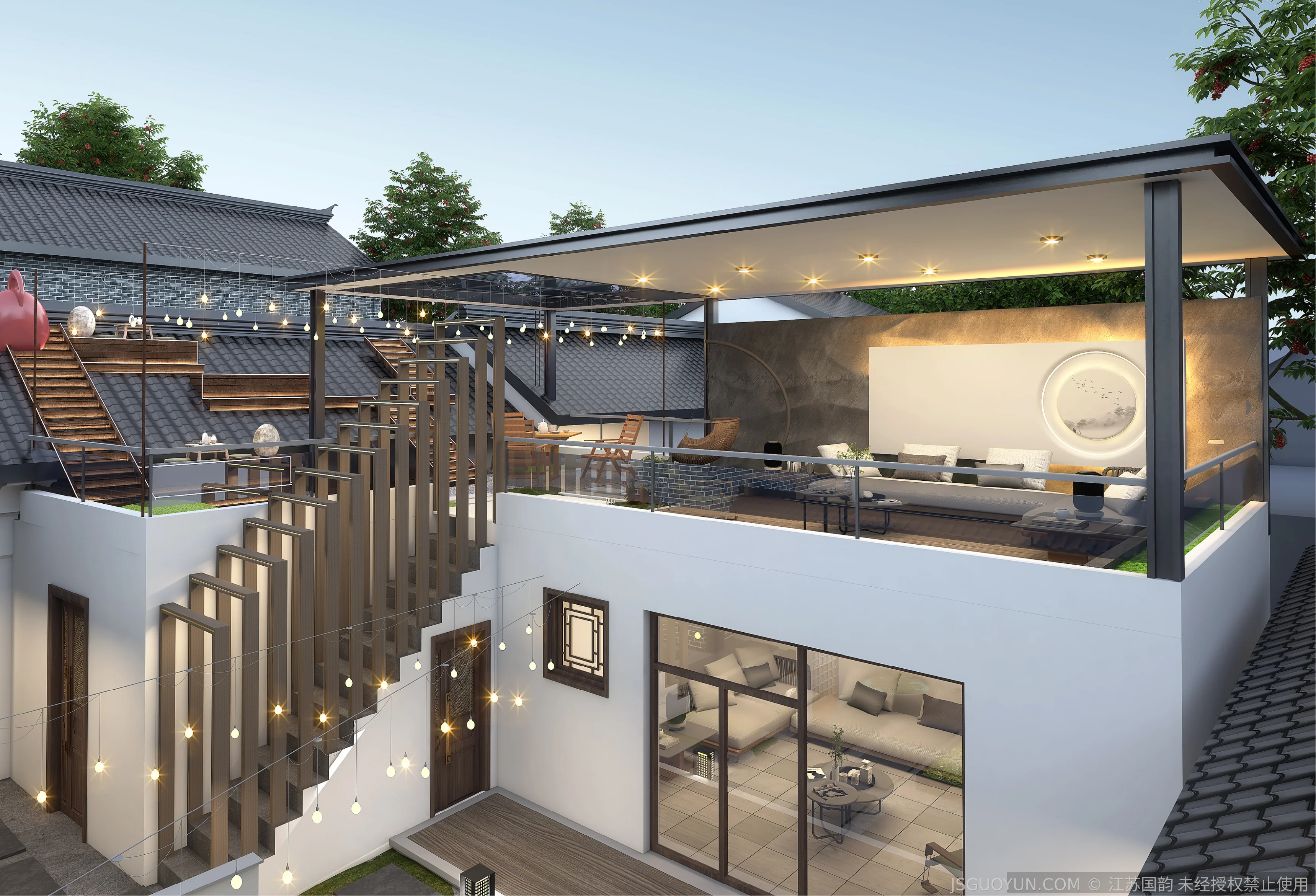 核心定位:打造古镇文脉与现代舒适共生的沉浸式民宿,传递河下的烟火诗意。 空间布局:公区、客房、露台分区清晰,兼顾休憩、观景、体验功能,适配旅居场景。 风格设计:提取明清民居肌理,以梁架、格栅为符号,营造古韵与松弛感兼具的氛围。 材质运用:选用实木、藤编、肌理墙等材质,复刻古镇温润质感,兼顾耐用性。 光影设计:以自然光与分层暖光,复刻古镇晨昏光影,营造静谧松弛的旅居氛围。 文化赋能:植入运河、戏曲等本土元素,以意境化表达传递河下文化内核。