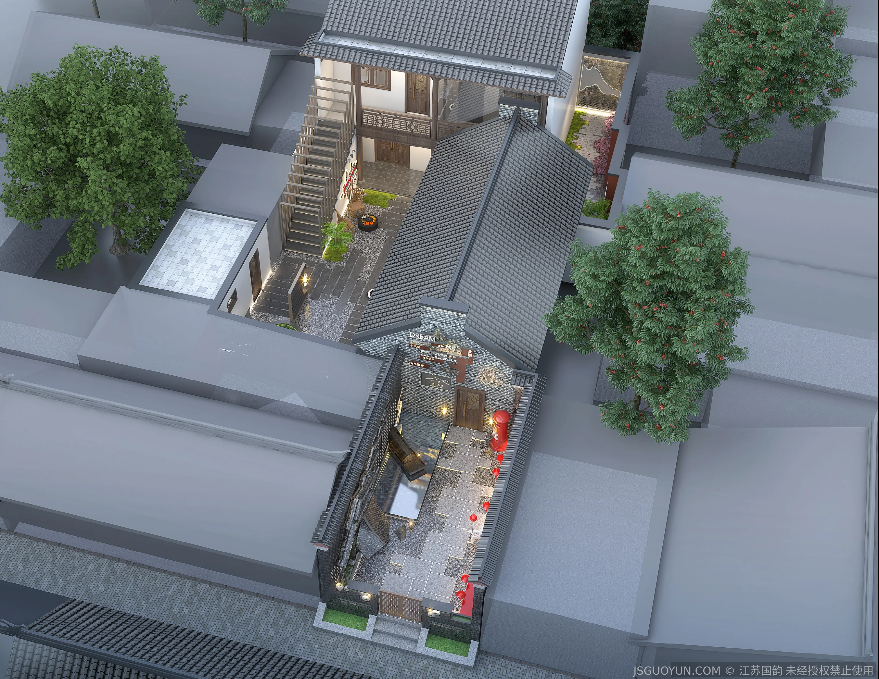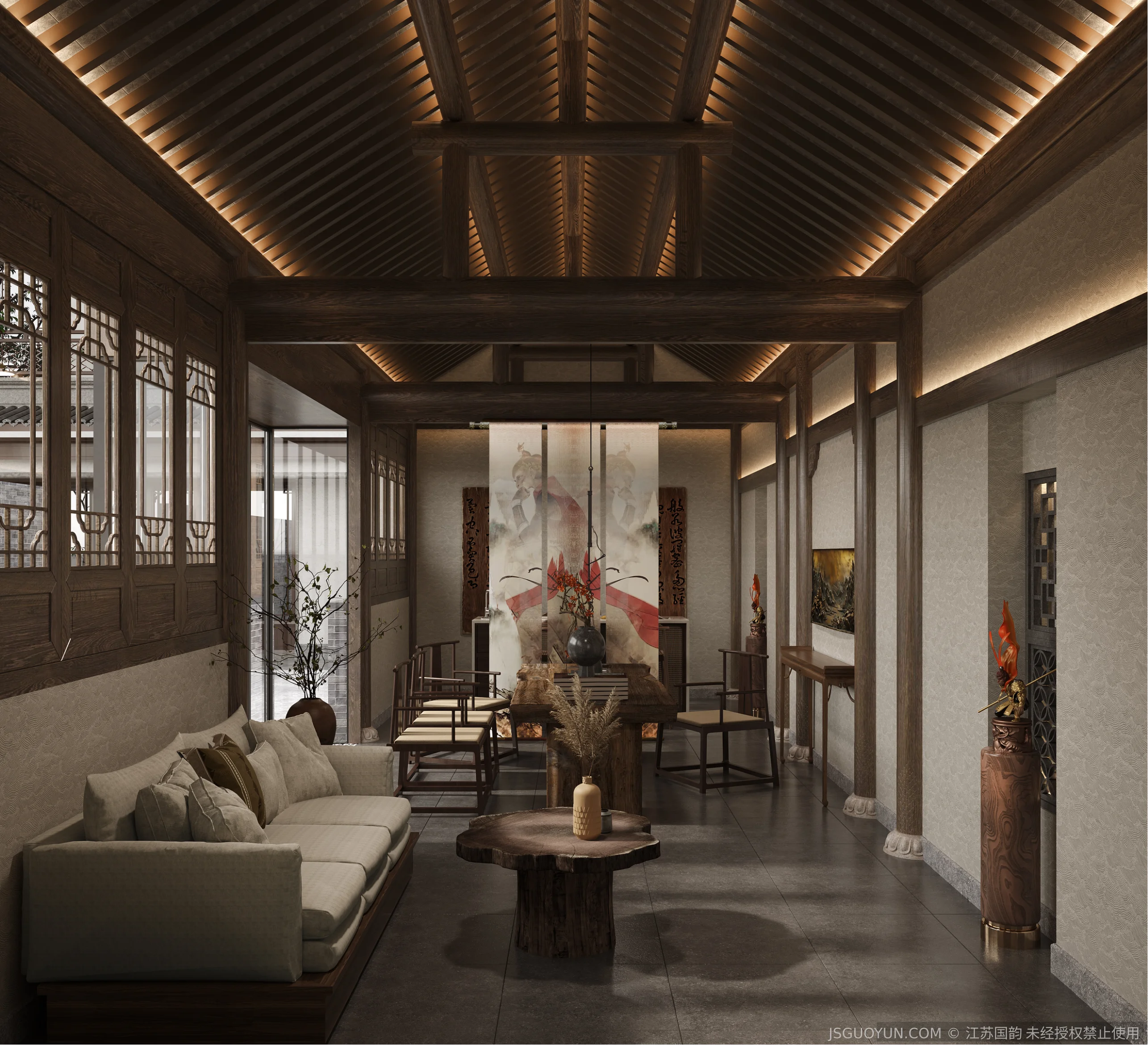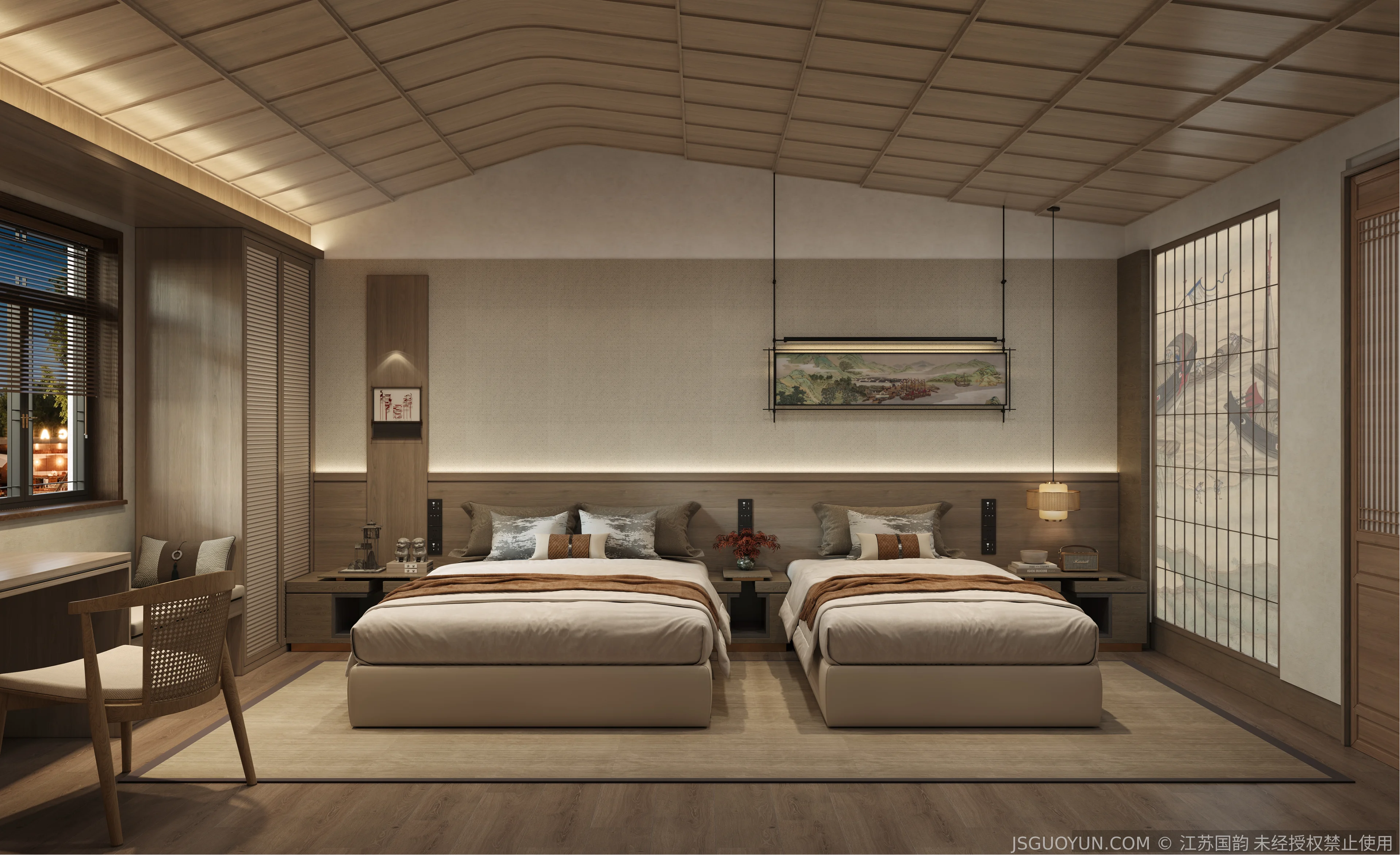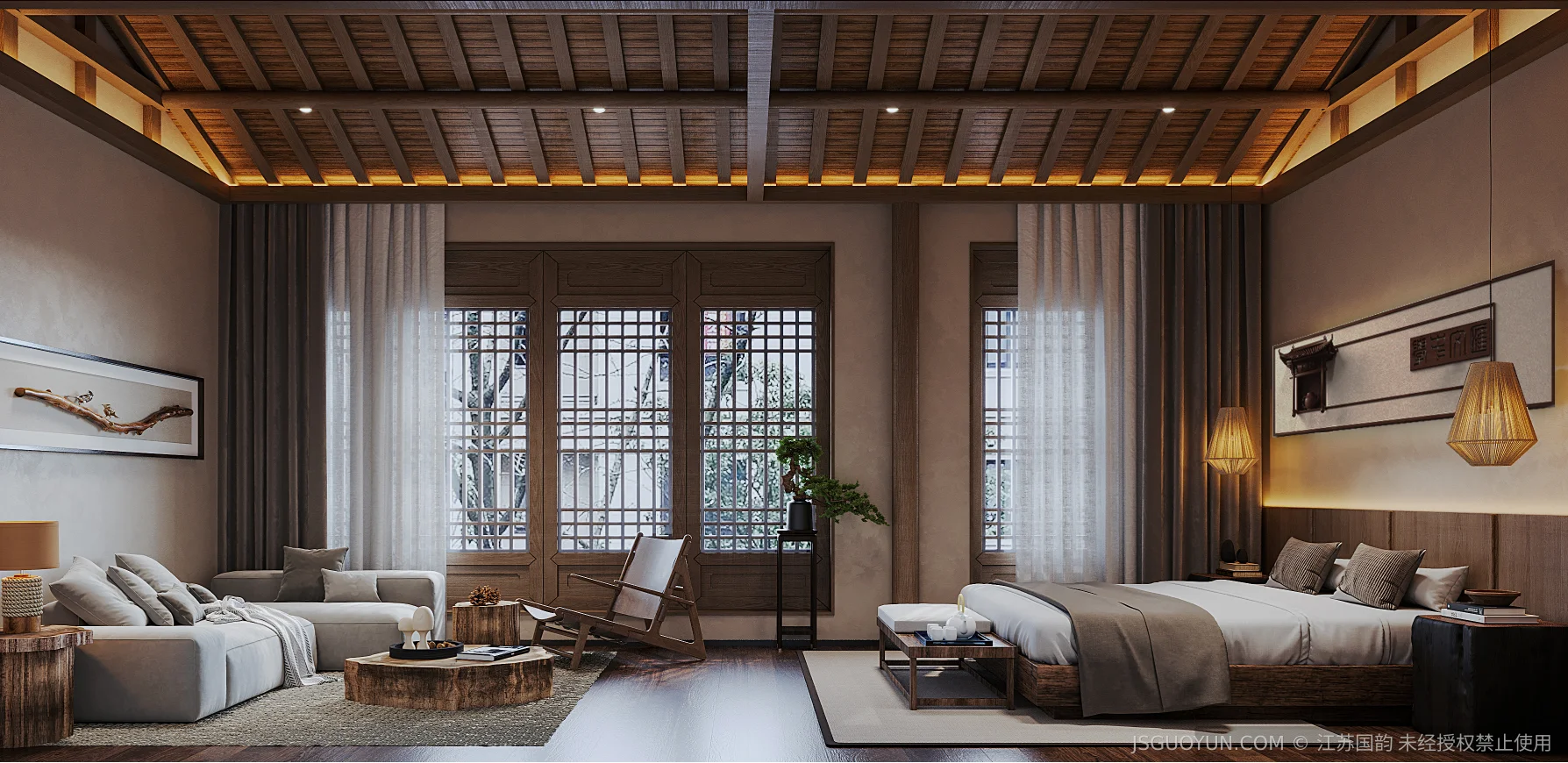 核心定位:打造古镇文脉与现代舒适共生的沉浸式民宿,传递河下的烟火诗意。 空间布局:公区、客房、露台分区清晰,兼顾休憩、观景、体验功能,适配旅居场景。 风格设计:提取明清民居肌理,以梁架、格栅为符号,营造古韵与松弛感兼具的氛围。 材质运用:选用实木、藤编、肌理墙等材质,复刻古镇温润质感,兼顾耐用性。 光影设计:以自然光与分层暖光,复刻古镇晨昏光影,营造静谧松弛的旅居氛围。 文化赋能:植入运河、戏曲等本土元素,以意境化表达传递河下文化内核。