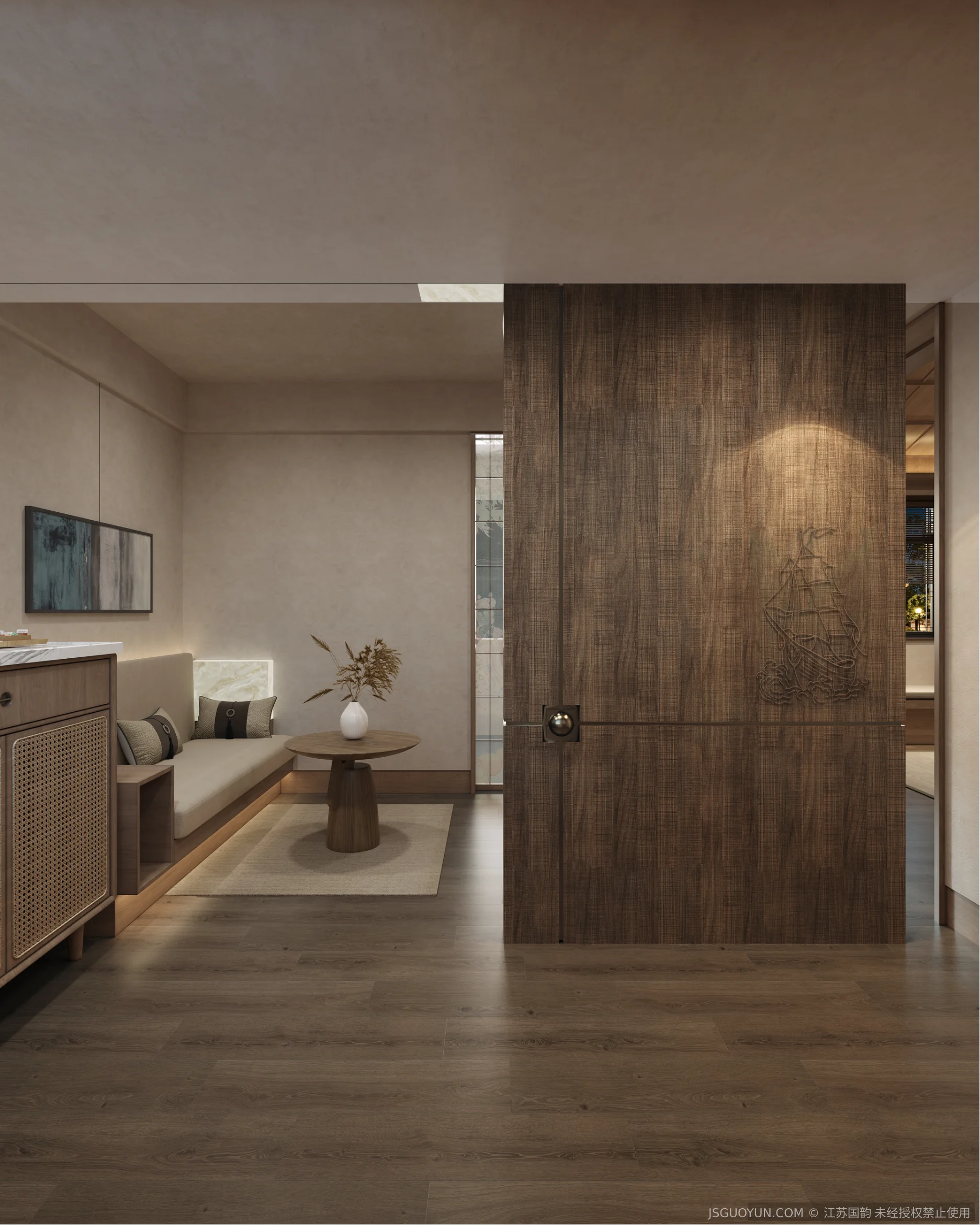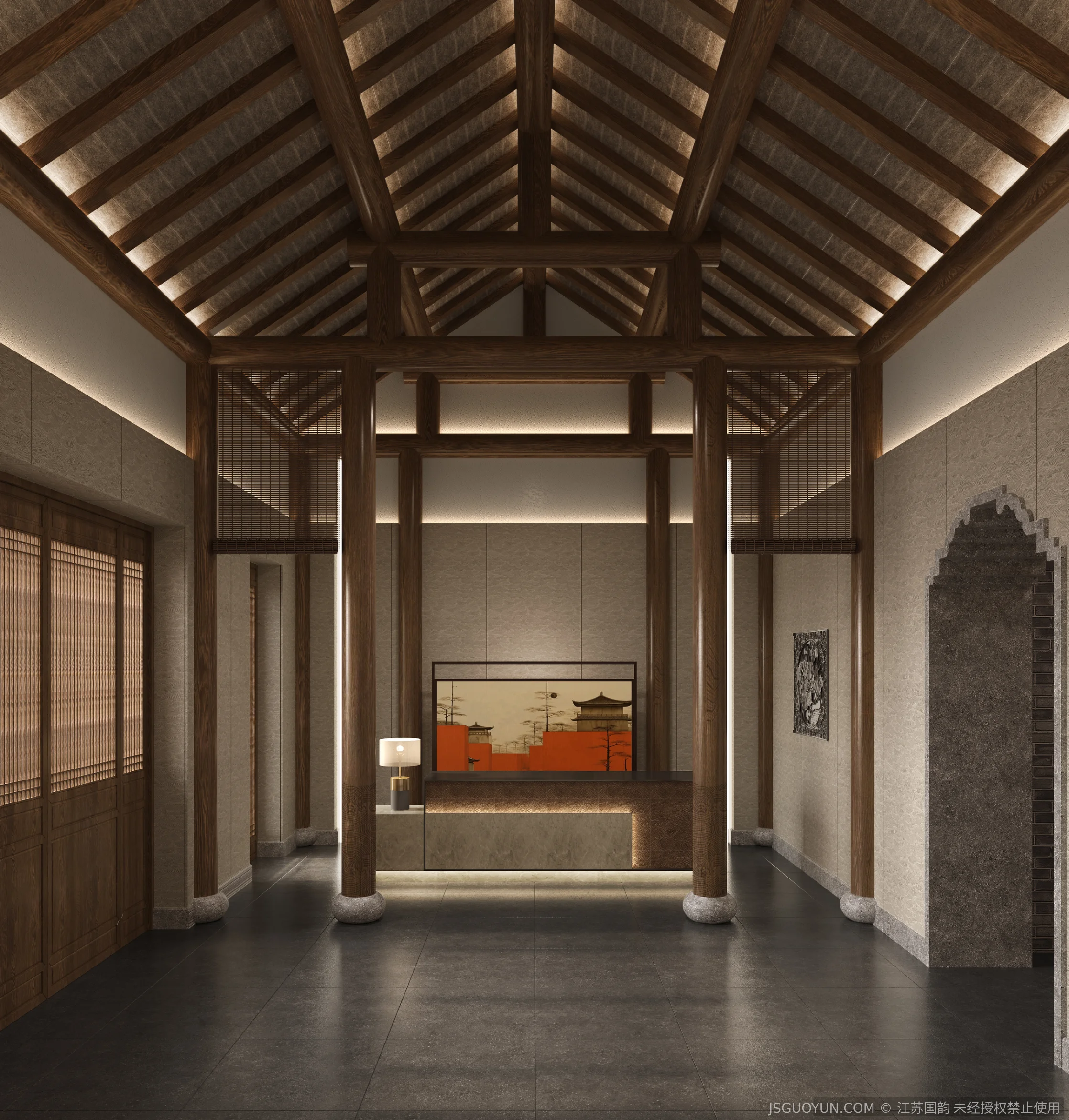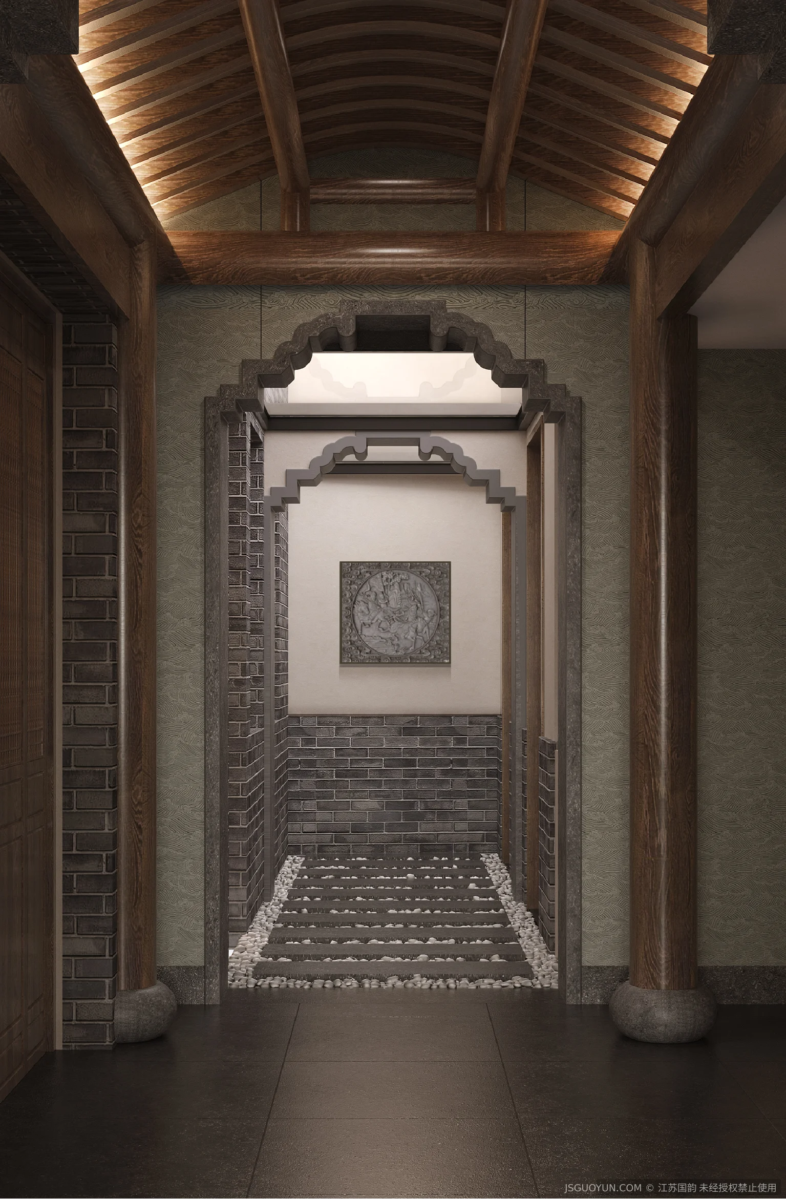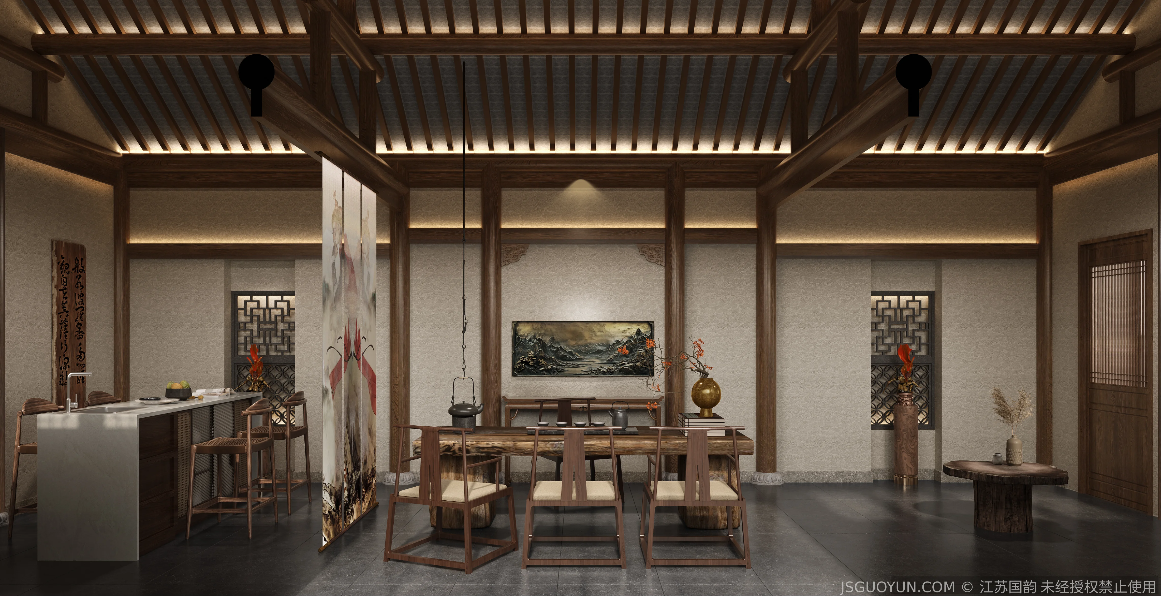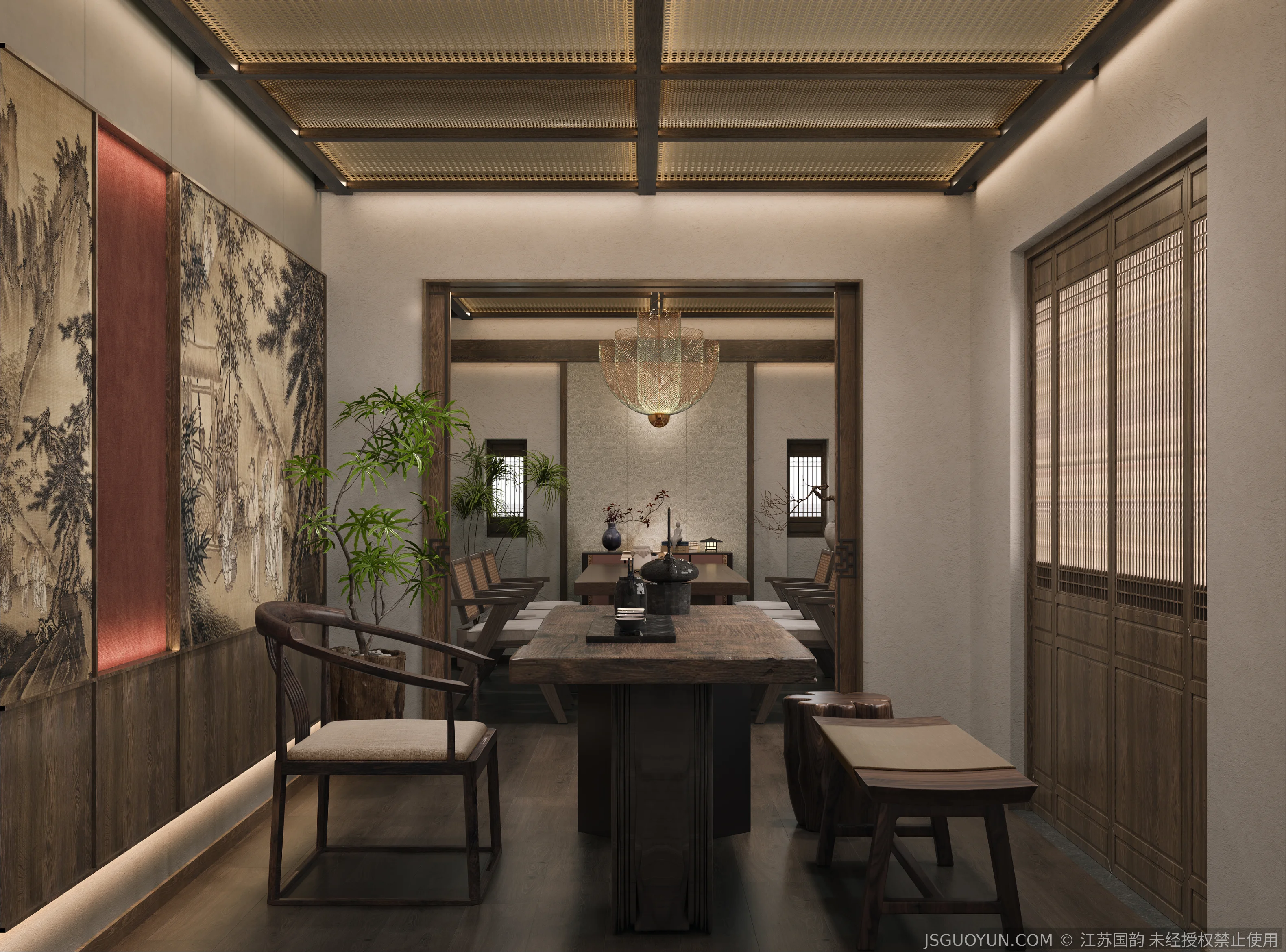 核心定位:打造古镇文脉与现代舒适共生的沉浸式民宿,传递河下的烟火诗意。 空间布局:公区、客房、露台分区清晰,兼顾休憩、观景、体验功能,适配旅居场景。 风格设计:提取明清民居肌理,以梁架、格栅为符号,营造古韵与松弛感兼具的氛围。 材质运用:选用实木、藤编、肌理墙等材质,复刻古镇温润质感,兼顾耐用性。 光影设计:以自然光与分层暖光,复刻古镇晨昏光影,营造静谧松弛的旅居氛围。 文化赋能:植入运河、戏曲等本土元素,以意境化表达传递河下文化内核。