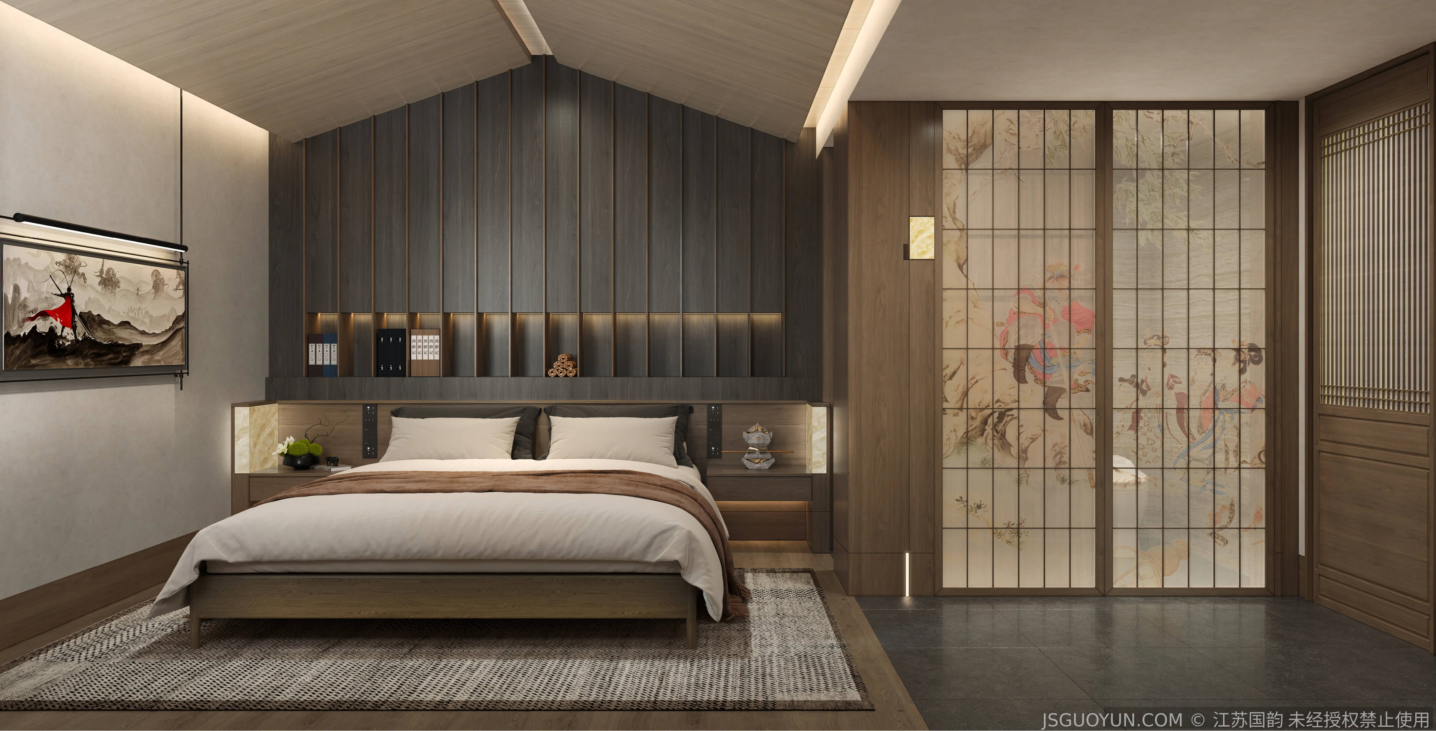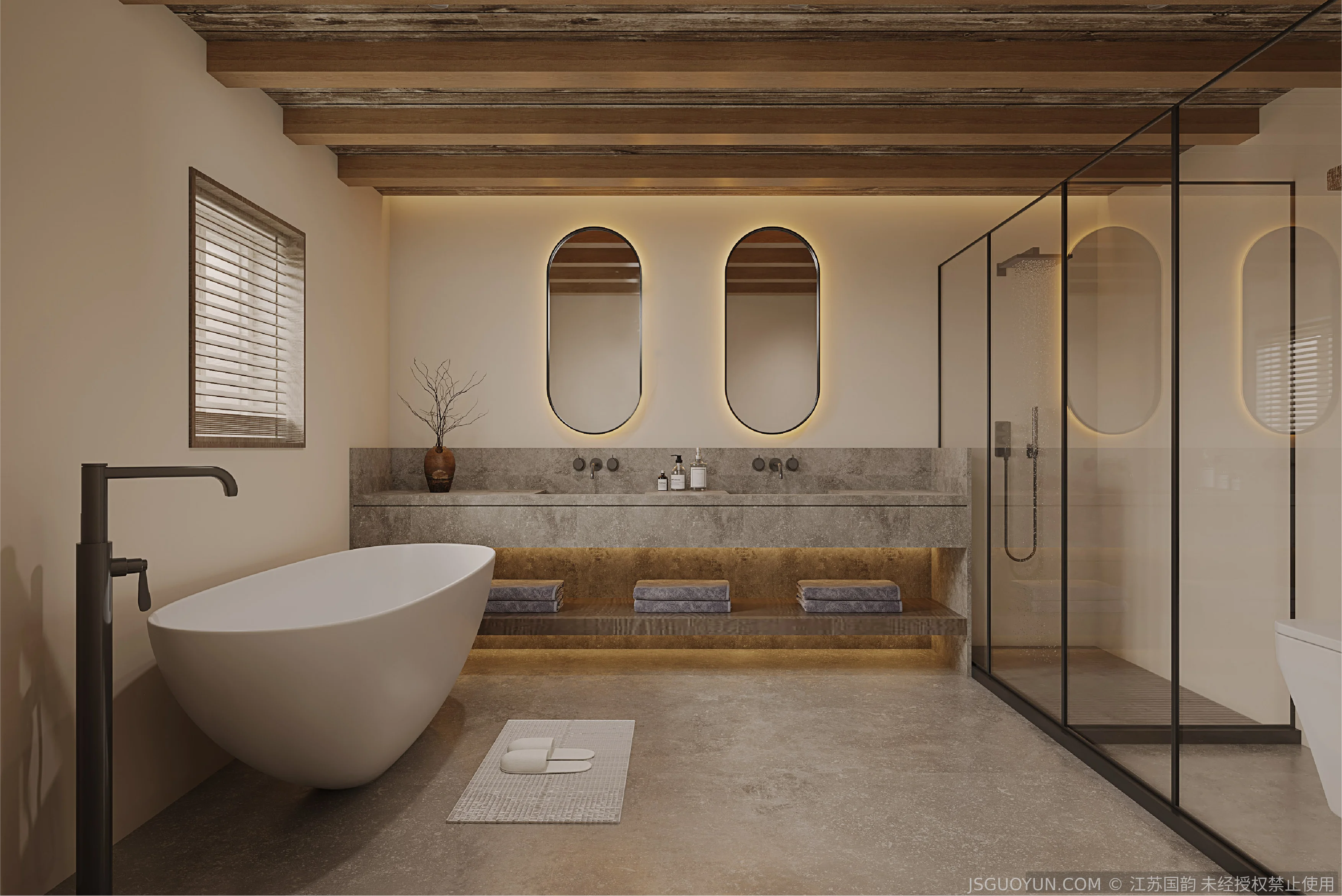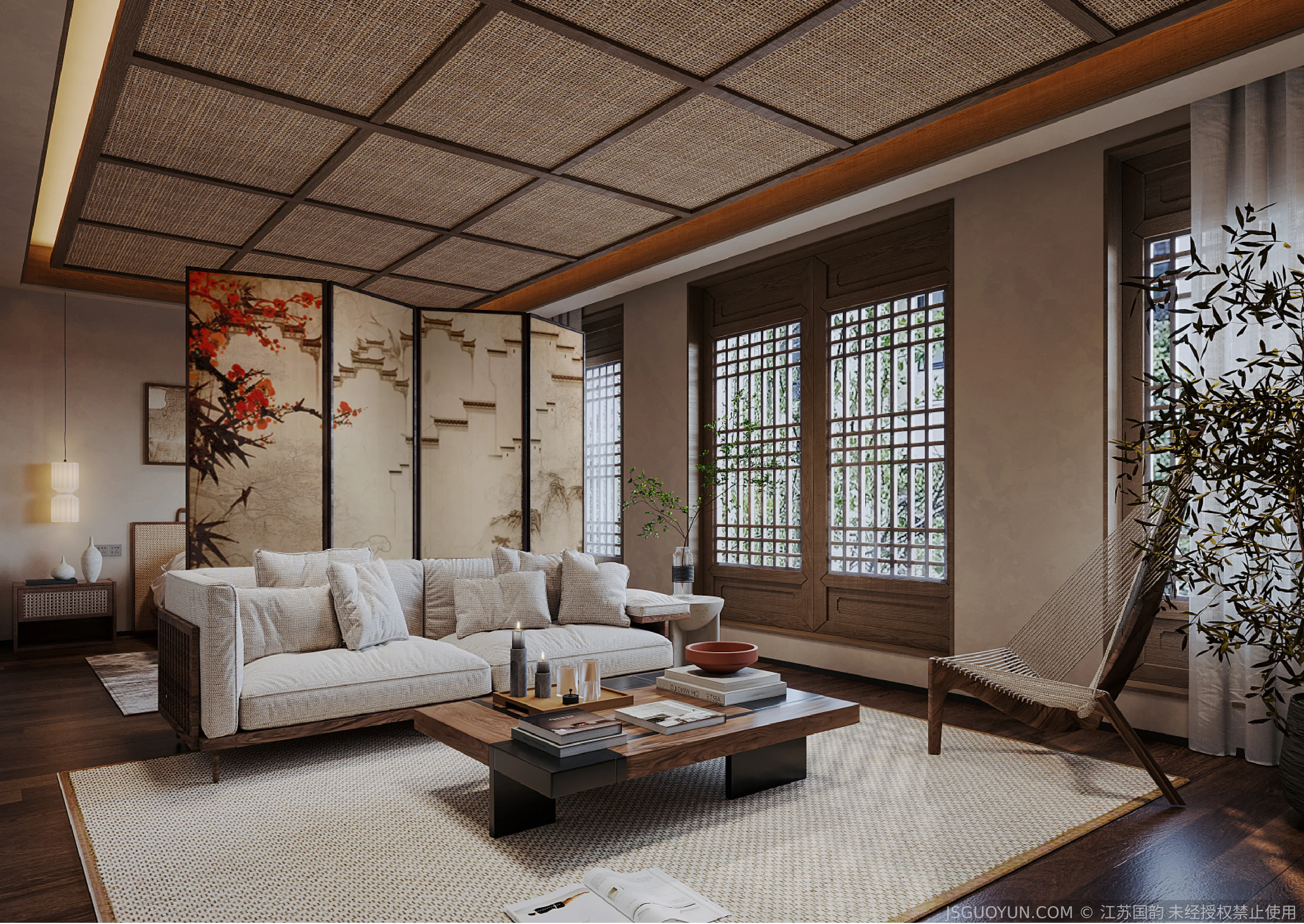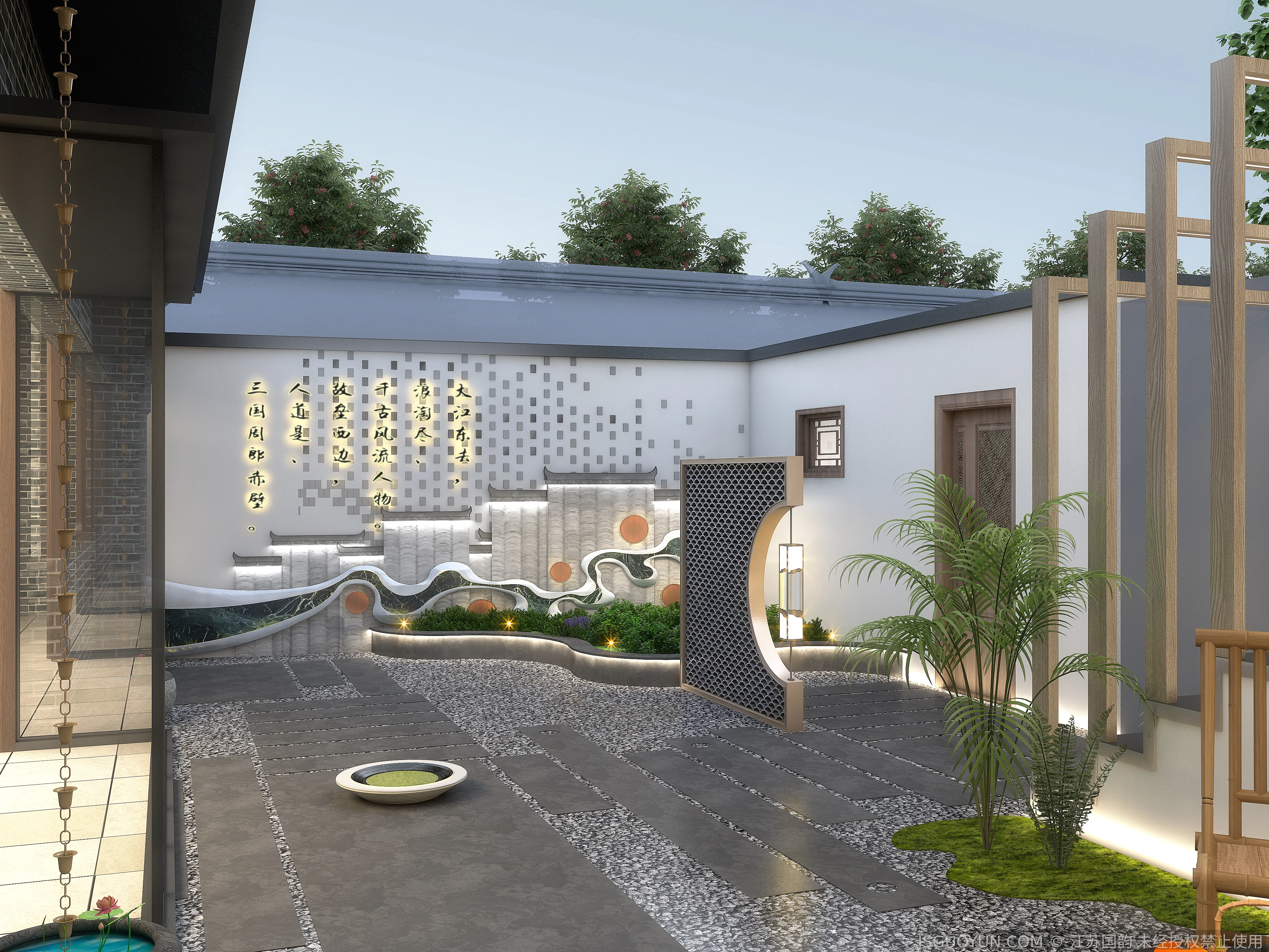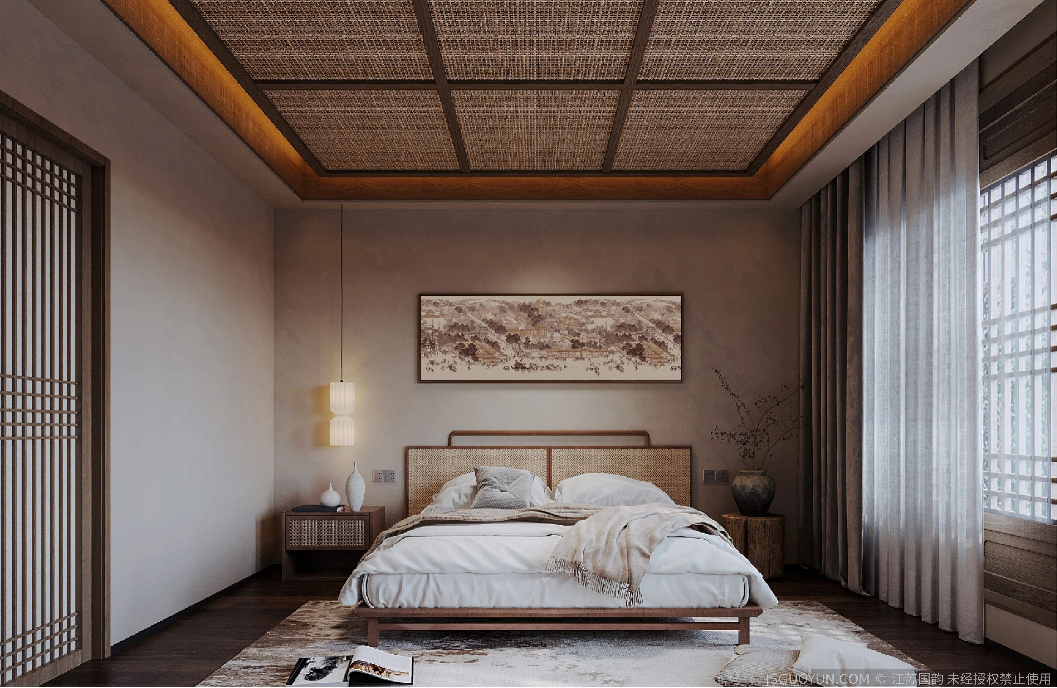 核心定位:打造古镇文脉与现代舒适共生的沉浸式民宿,传递河下的烟火诗意。 空间布局:公区、客房、露台分区清晰,兼顾休憩、观景、体验功能,适配旅居场景。 风格设计:提取明清民居肌理,以梁架、格栅为符号,营造古韵与松弛感兼具的氛围。 材质运用:选用实木、藤编、肌理墙等材质,复刻古镇温润质感,兼顾耐用性。 光影设计:以自然光与分层暖光,复刻古镇晨昏光影,营造静谧松弛的旅居氛围。 文化赋能:植入运河、戏曲等本土元素,以意境化表达传递河下文化内核。